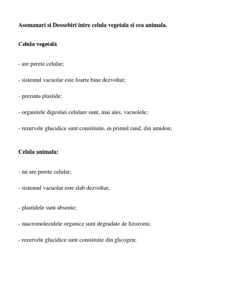 Asemanari Si Deosebiri Intre Celula Vegetala Si Cea Animala