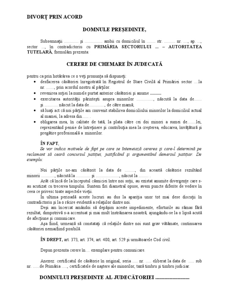 Acte Necesare Depunerea Cerere De Chemare In Judecata Divort Model