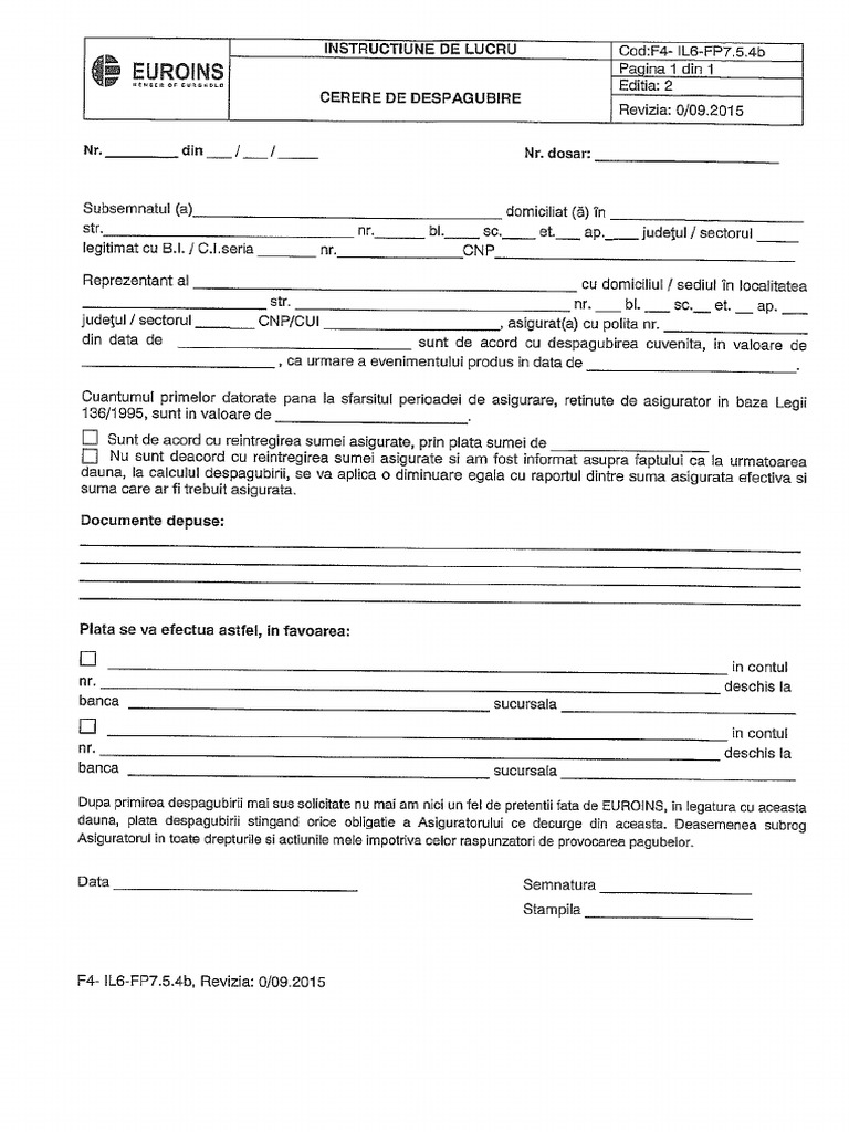 Prin plata despagubirii declar ca nu mai am alte pretentii fata de city insurance si fata de persoana vinovata de producerea accidentului suma de reprezentand despagubirea integrala pt daunele suferite ca urmare a evenimentului. Euroins cerere de despagubire euroins. Asirom cerere de despagubire asirom. Euroins romania isi rezerva dreptul de a solicita si alte documente decat cele precizate mai sus cu scopul de a analiza cauzele producerii riscului asigurat si dimensiunea prejudiciului.