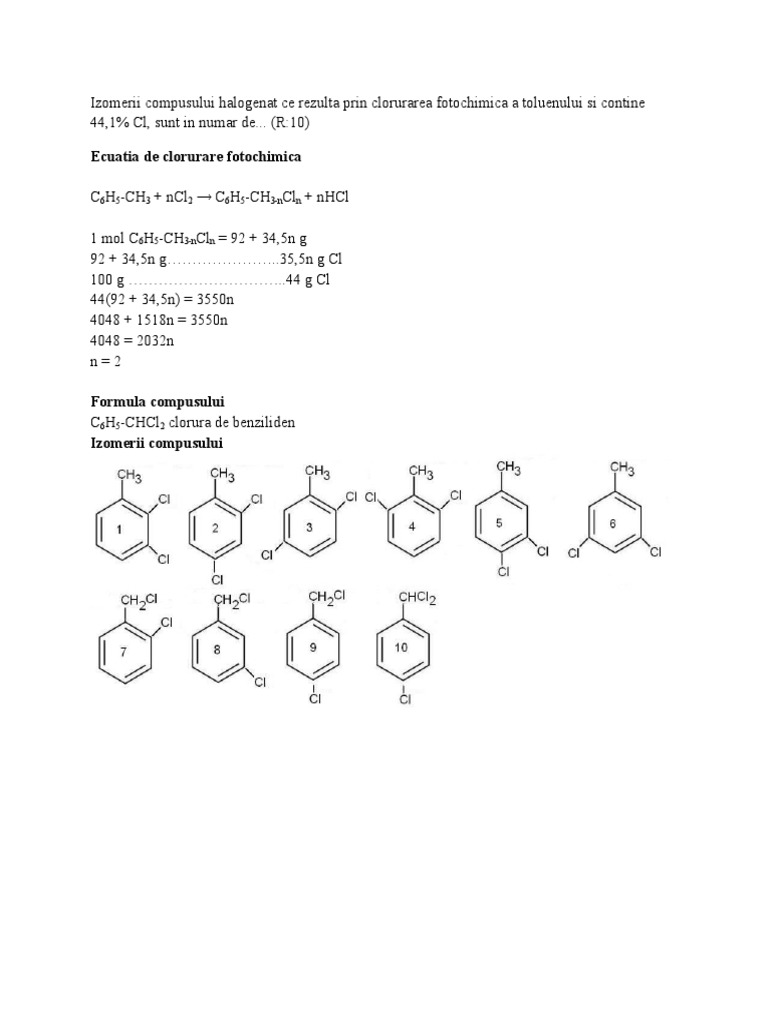 Izomerii Compusului Halogenat Ce Rezulta Prin Clorurarea Fotochimica A Toluenului Si Contine 44 Doc