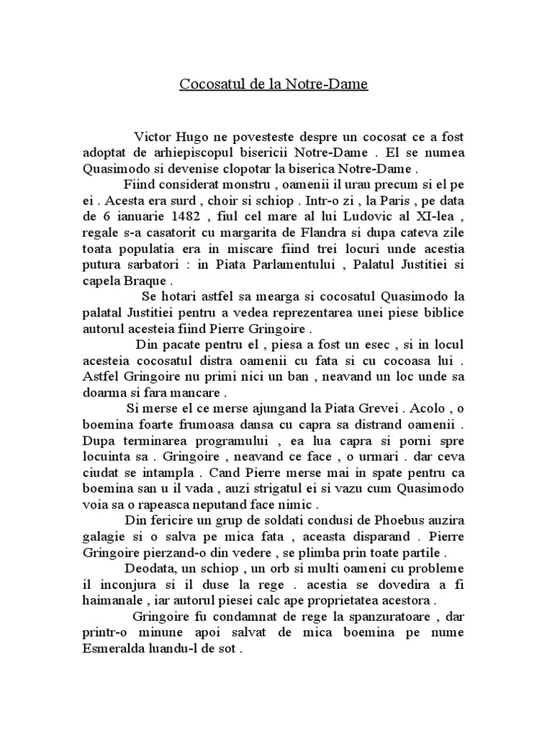 Intr o zi la paris pe data de 6 ianuarie 1482 fiul cel mare al lui ludovic al xi lea regale s a. Detail 4 cocosatul de la notre dame personaje rezumat de victor hugo quasimodo cocosatul de la notre dame claude frollo prietenul lui quasimodo esmeralda tigancusa dansatoare pierre scriitorul capitanul phoebus cel care o salveaza pe esmeralda paquette femeia care traia in. Intr o zi la paris pe data de 6 ianuarie 1482 fiul cel mare al lui ludovic al xi lea regale s a casatorit cu margarita de flandra si dupa cateva zile toata populatia era in miscare fiind trei locuri unde acestia putura sarbatori. In piata parlamentului.