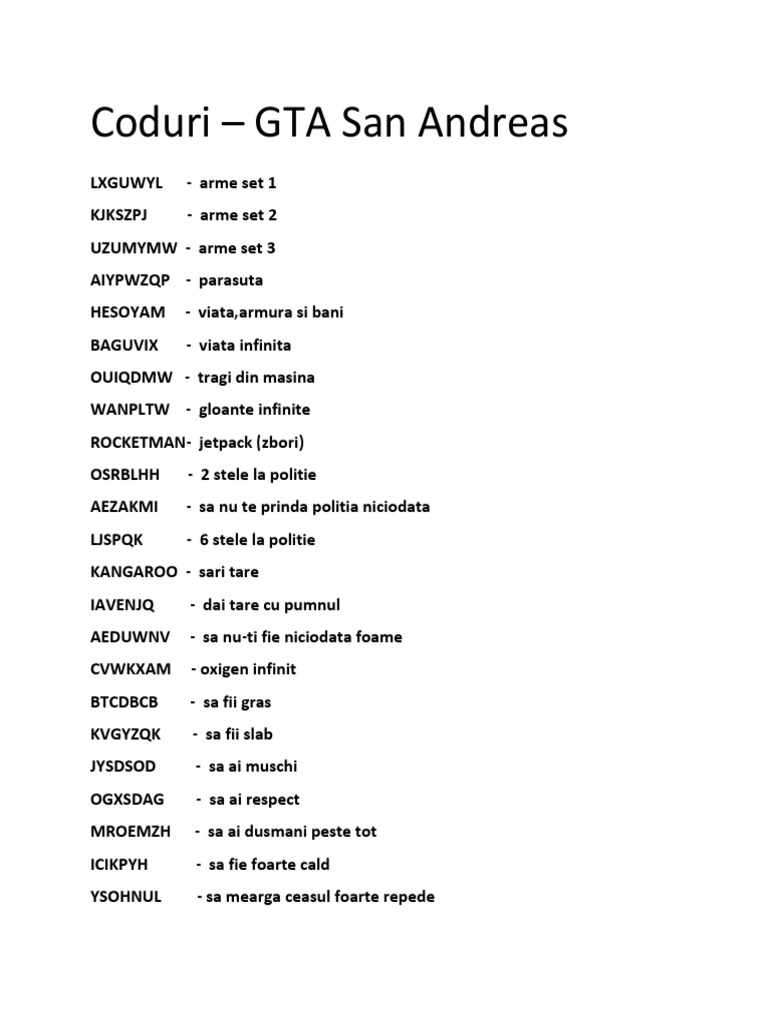 Parole Gta San Andreas Lista Completa A Codurilor Gta